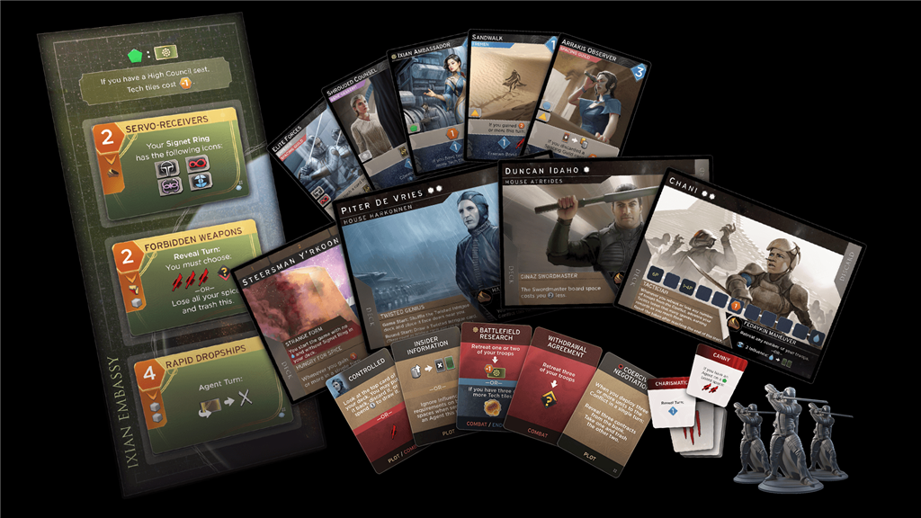 Ontdek nieuwe mogelijkheden met 86 extra kaarten, 9 unieke leiders en het Ixian Embassy-bord dat je extra routes naar de overwinning biedt. Sluit geheime contracten, zet de Sardaukar Commanders in om conflicten te domineren en gebruik innovatieve tech-tegels om je tegenstanders steeds een stap voor te blijven.
