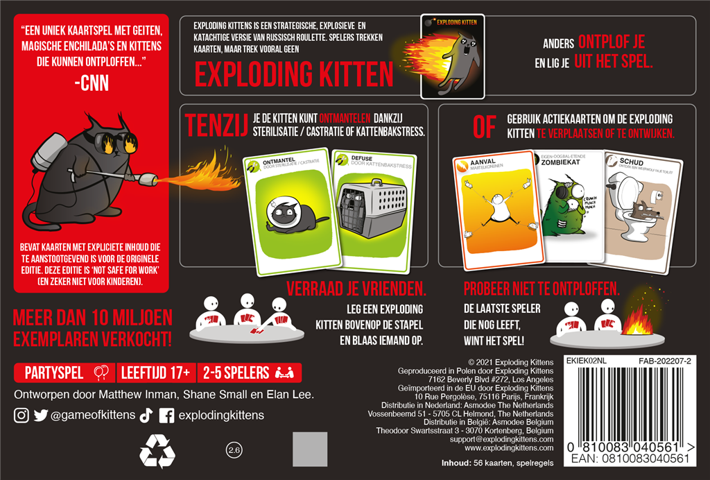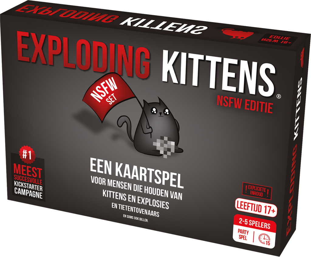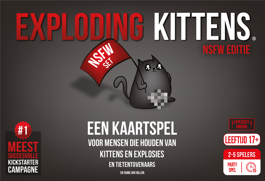 Het kaartspel Exploding Kittens is voor mensen die van katten en explosies houden, maar ook voor tietmagiërs en billenliefhebbers. Dit spel is het meest succesvolle project ooit op Kickstarter! Exploding Kittens is gemaakt door Elan Lee (XBOX), Matthew Inman (The Oatmeal) en Shane Small (XBOX, Marvel) en is een soort Russisch roulette spel: je neemt een kaart van de stapel tot je een exploding kitten kaart krijgt, op dat moment heb je verloren. Met alle andere kaarten kan je je verdedigen, aanvallen, een beurt overslaan of de katten afleiden.. Deze speciale NSFW-(Not Safe For Work)editie is geschikt voor volwassen als feestspel voor 2-5 spelers (tot 9 spelers wanneer gecombineerd met een ander deck).