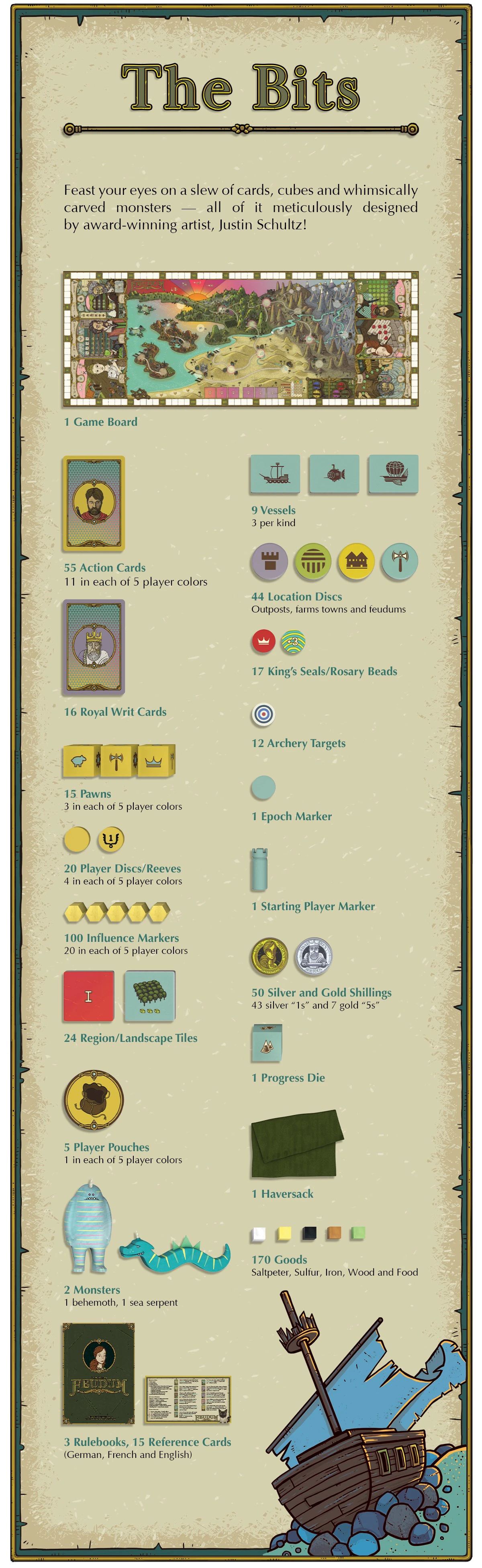 Wat deze editie bijzonder maakt is de aandacht voor detail. De componenten zijn verbeterd en de illustraties zijn opnieuw bekeken zodat kleuren, vormen en symbolen nog helderder en aantrekkelijker zijn. De bekende kunststijl van Justin Schultz komt in deze uitgave nog sterker naar voren en dat zorgt voor een bordspel dat tijdens het spelen bijna als een verhaal voelt. Het materiaal is stevig, de miniaturen zijn prachtig vormgegeven en de doos heeft een luxe uitstraling die meteen duidelijk maakt dat dit een spel is voor de echte kenner.