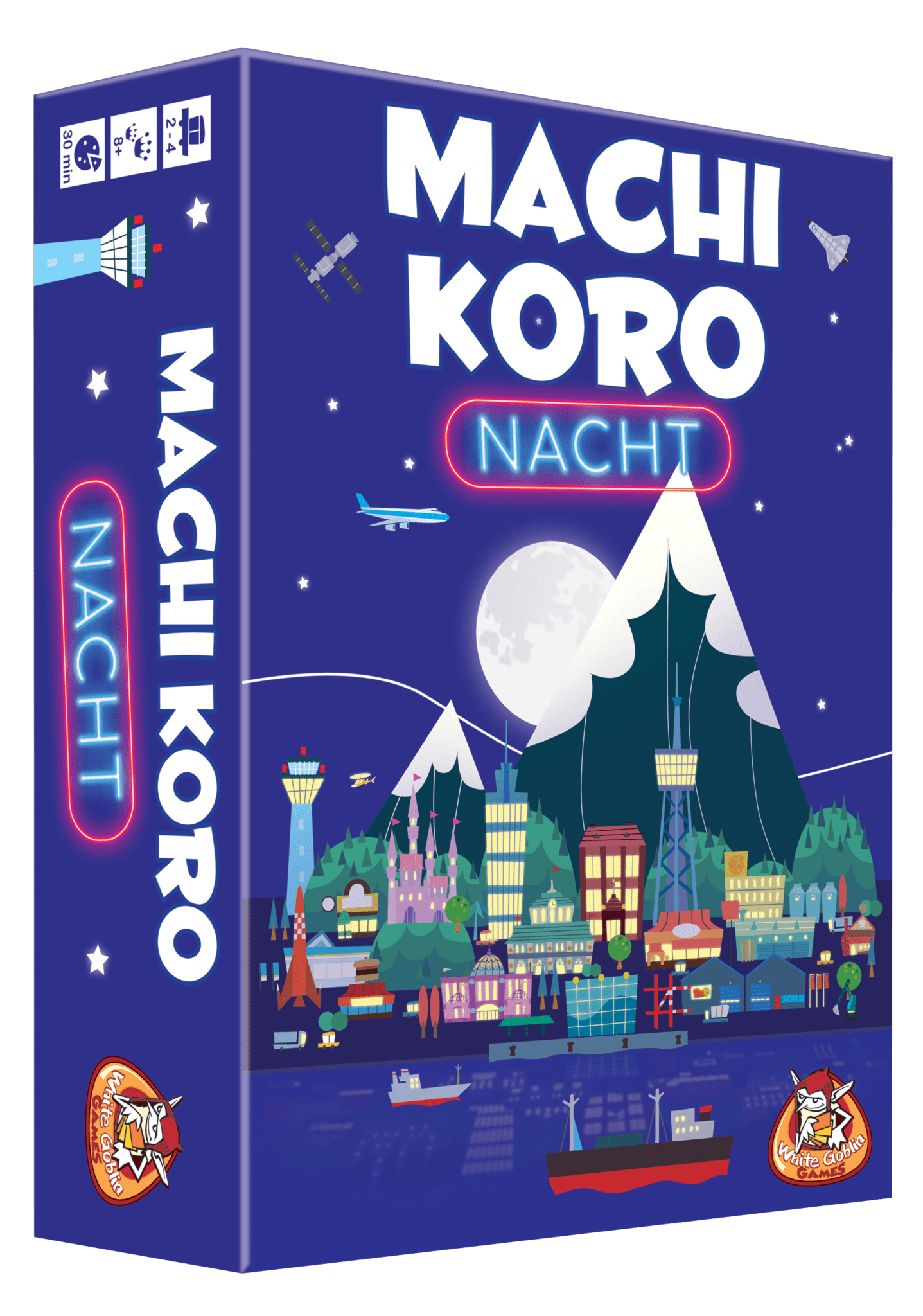 Machi Koro Nacht is een het basisspel gecombineerd met een selectie van de kaarten uit de uitbreidingen Machi Koro Haven en Metropool in een nachtelijk thema gegoten.