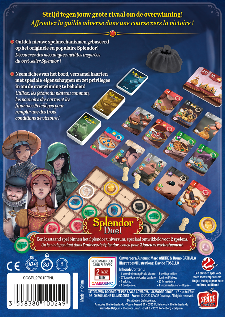 Splendor Duel is een spannend nieuw spel voor twee spelers binnen het Splendor-universum, met unieke en innovatieve spelmechanieken, ontworpen door Marc Andre en Bruno Cathala.