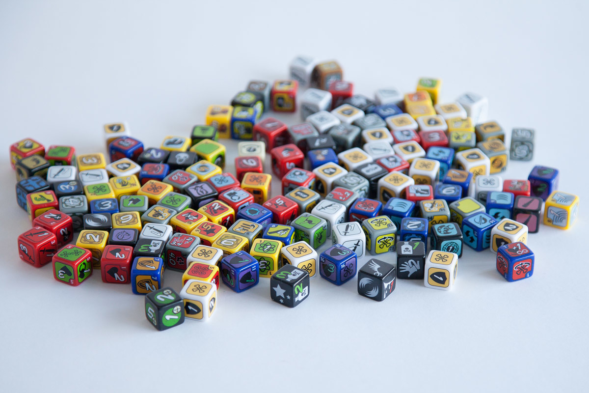 - 139 Dice (138 Heat Transfer Imaged Custom Dice + 1 Black D6)
