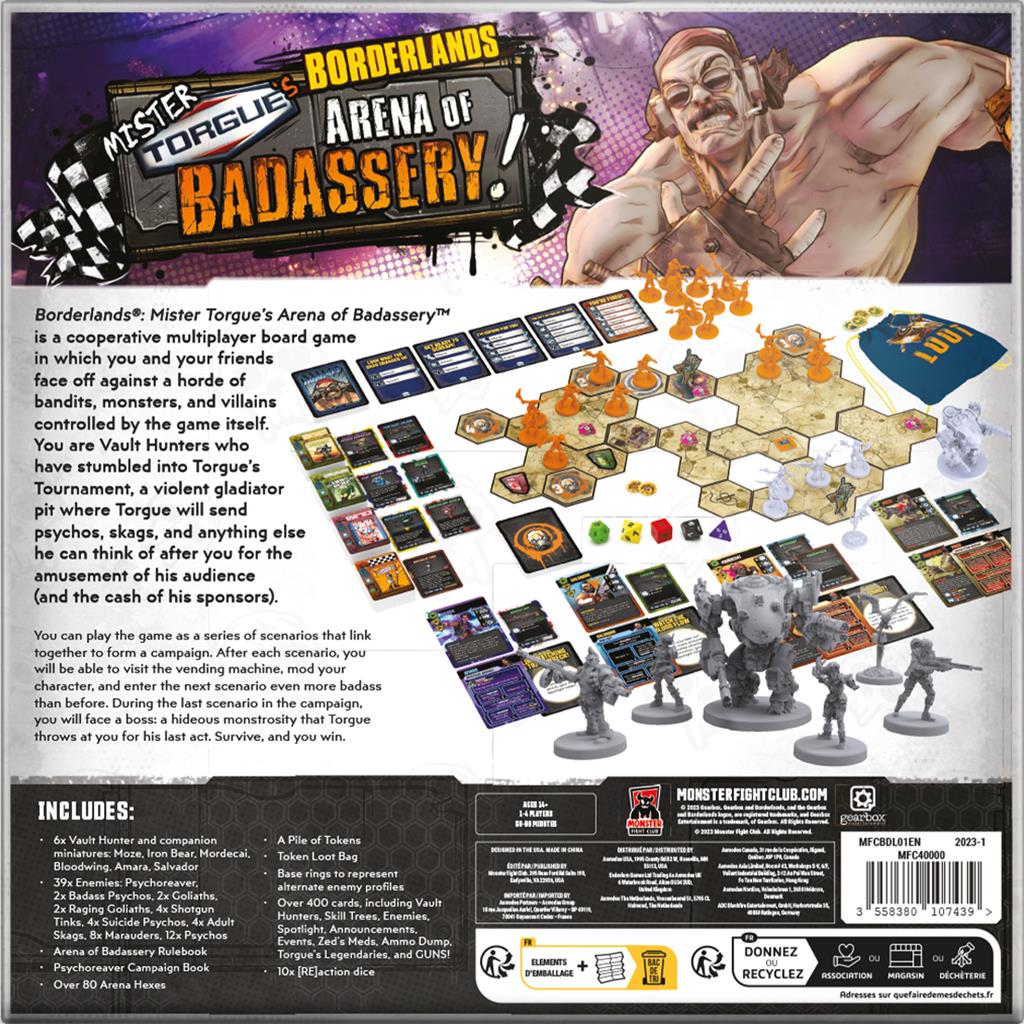 Borderlands: Mister Torgue's Arena of Badassery is een coöperatief bordspel gebaseerd op de populaire Borderlands-videogameserie. In dit spel nemen 1 tot 4 spelers de rol aan van Vault Hunters die deelnemen aan Mister Torgue's explosieve arena, waar ze geconfronteerd worden met een verscheidenheid aan vijanden, zoals skags, bandieten en psychopaten. Spelers kunnen kiezen voor een eenmalige strijd vol actie en explosies of deelnemen aan een campagne waarin hun personages tussen de gevechten door sterker worden. Tijdens de campagne kunnen spelers hun Vault Hunter upgraden door betere uitrusting aan te schaffen bij verkoopautomaten, unieke vaardigheidsbomen te ontwikkelen en epische nieuwe wapens te bemachtigen. Deze progressie stelt hen in staat om zich voor te bereiden op de ultieme uitdaging: het verslaan van de eindbaas, een ultieme moordmachine die vastbesloten is hen te vernietigen.